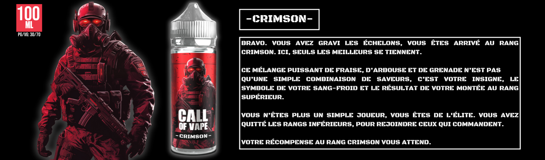 Bravo, vous faites partie de l'élite! Découvrez le CRIMSON et son mélange puissant et explosif de Fraise, d'Arbouse et de Grenade. Plus qu'une simple combinaison de saveur, ce nouveau mélange est le symbole de votre montée au rang supérieur.