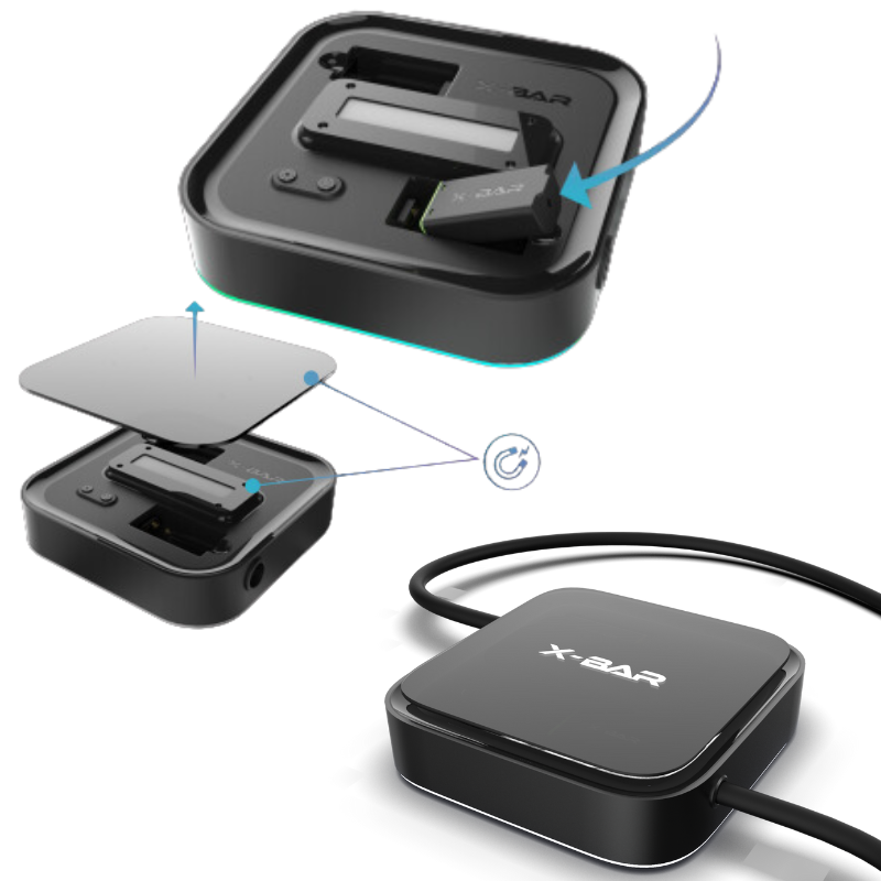 | Les Pods X-Shisha de X-Bar sont insérables en dessous du "couvercle" X-Bar.Deux encoches sont prévues pour les Pods, ce qui permet d'utiliser deux saveurs différentes simultanément via deux tuyaux (fournis avec le Kit X-Shisha) clipsables sur les côtés du Kit. |