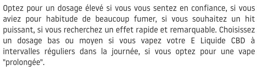 Attention : Nous déconseillons l'utilisation des e-liquides CBD sur équipement sub-ohm. Les e-liquides CBD ont été conçus pour fonctionner de manière optimale sur de petits équipements ou des systèmes à pods rechargeablessur une valeur de résistance 1,oOhm-1,2Omh pour un idéal 15W max