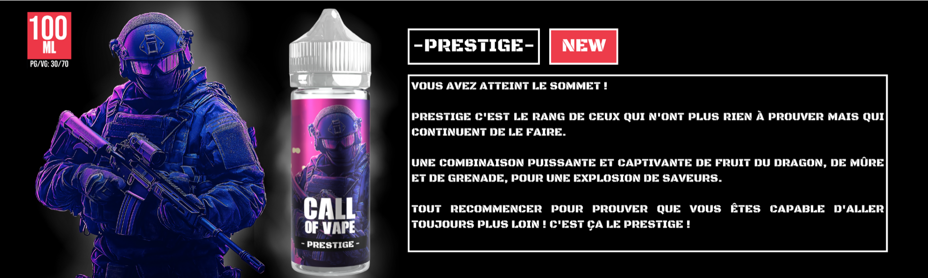 PRESTIGE c'est le rang de ceux qui n'ont plus rien à prouver mais qui continuent de le faire. Une combinaison puissante et captivante de Fruit du Dragon, de Mûre et de Grenade, pour une explosion de saveurs.